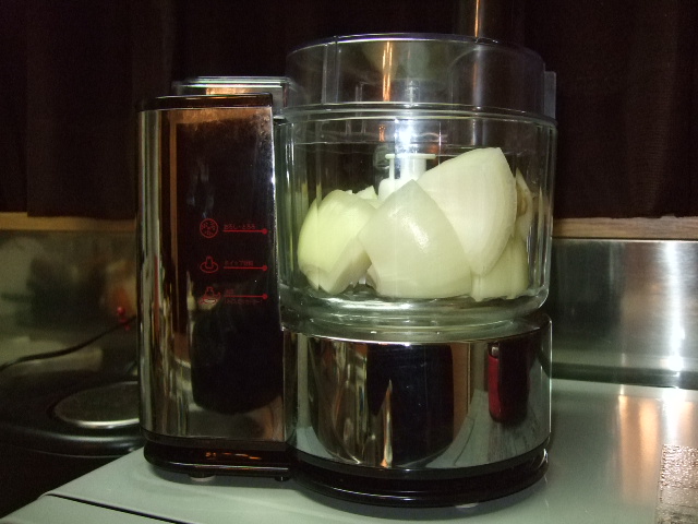 タマネギ、ニンニク、セロリ、生姜をフード・プロセッサーに。
